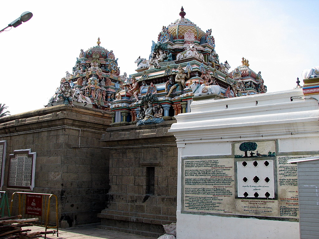 The presiding deity of this temple is a form of Shiva called Kapaleashwarar. The form of Shiva’s wife Parvati at this temple is called Karpagambal (from the Tamil for “goddess of the wish-yielding tree”). Legend has it that Lord Shiva was once telling Lord Brahma, the Hindu god of creation, about the creation of the three lokas but Lord Brahma did not agree with what Shiva said. Shiva got angry and plucked out one of Brahma’s four heads. Brahma begged for forgiveness and was asked to perform penance at Mayilai (Mylapore) and then he asked Lord Shiva to take the name of Kapaleashwarar as Lord Shiva (eswarar) was wearing a necklace of skulls (kapala).